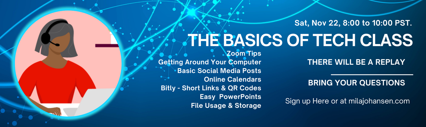 The instructor, Mila Johansen, is a best selling, published author of 12 books and has taught basic tech in a classroom with 24 computers for years, along with public speaking, writing and publishing for the past twenty years.